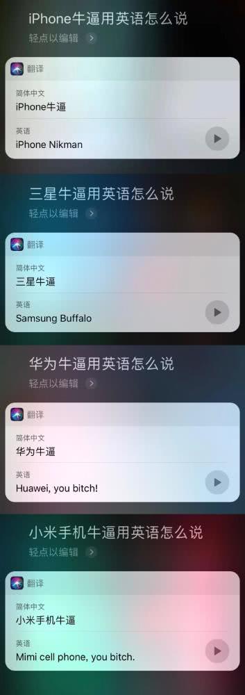 網(wǎng)友測試發(fā)現(xiàn),當(dāng)向蘋果siri提問“華為牛逼用英語怎么說”,Siri將其翻譯成“Huawei,you bitch”。當(dāng)把主語換成小米時,也會出現(xiàn)“you bitch”內(nèi)容。而當(dāng)主語換成蘋果時,翻譯為:Apple is so awesome。